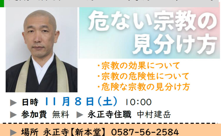 イベント    今月は「危ない宗教の見分け方」!宗教の効果について?宗教の危険性について?危険な宗教の見分け方!中村建岳が、11/8(土)にお話しします。永正寺定期法話会!