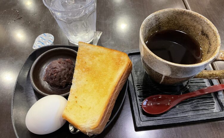 モーニング 「古今堂」で、厚切りトースト、ゆで卵、小倉(つぶあん)付きのモーニング!