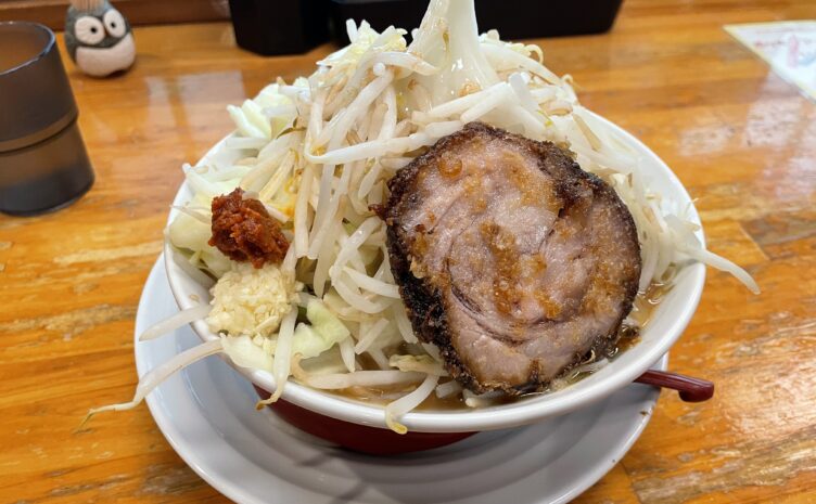 ラーメン 『ラーメン 飛べ豚』で、ラーメン並!ニンニクあり、ヤサイマシマシ、アブラアリ、カラミソアリ、チャーシュー揚げる!ど乳化濃厚鶏豚骨スープ!極太ワシワシ麺!二郎系ラーメン!