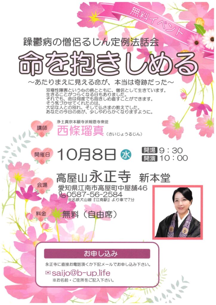 西條瑠真さん「命を抱きしめる」10/8(水)10時永正寺『定期法話会』毎月8日開催定期法話会お問い合わせは、永正寺(0587-56-2584)へお願いいたします。
