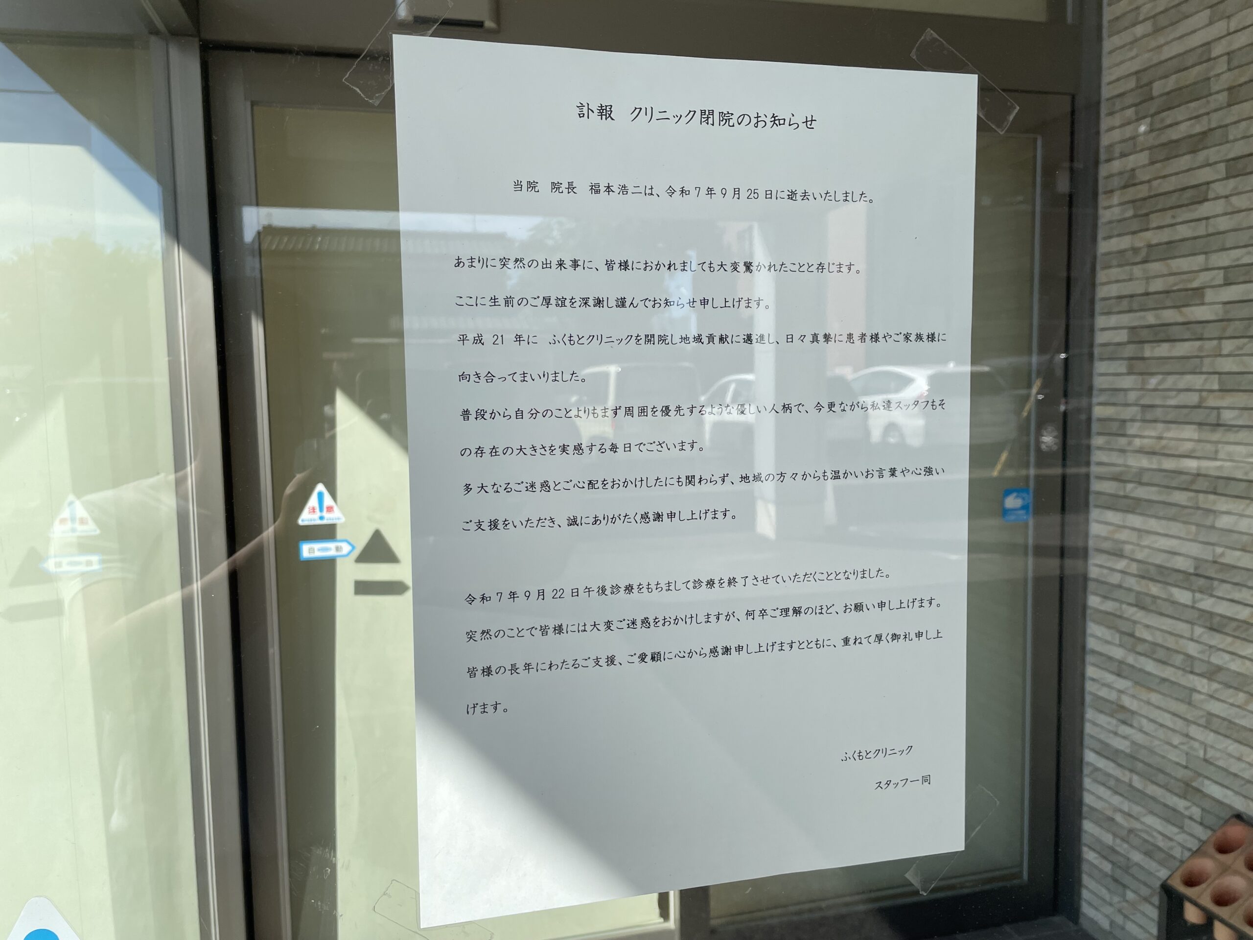「クリニック閉院のお知らせ」と張り紙がされていました。 開店・閉店 Twitter Facebook はてブ Pocket LINE コピー 2025.10.07 「クリニック閉院のお知らせ」と張り紙がされていました。 スポンサーリンク 目次 張り紙場所はココ 張り紙 突然のことだったみたいですね。 ふくもとクリニックが、9/22で閉院されていたみたいです。 ⇒江南市の開店閉店 場所はココ 「江南しえなんLINE公式アカウント」を友達追加! ボタンをポチポチポチっと押してね♪ 「しえなんカード(名刺)を置きたい!」「うちも取材してほしい!」という会社やお店の方がいらっしゃいましたらご連絡お待ちしています♪ 情報提供・お問い合わせ・Facebook、twitter または konanjoho@yahoo.co.jp まで