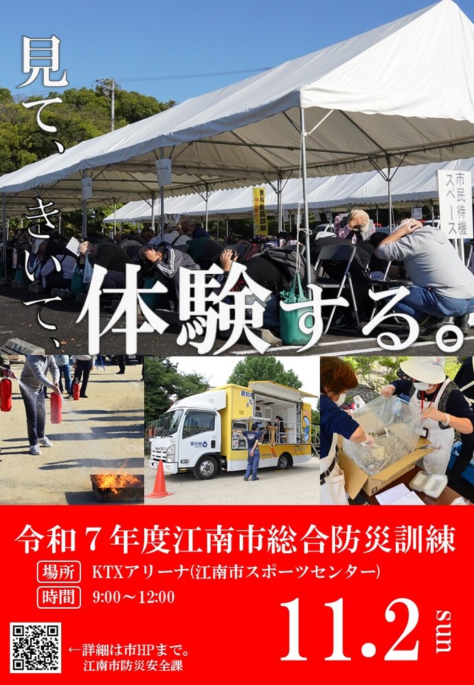 シェイクアウト訓練・道路施設応急復旧訓練・応急給水訓練・炊き出し訓練・トリアージ訓練・アマチュア無線機通信訓練・VR避難訓練体験・起震車体験・避難所体験・ボランティアセンター活動訓練・消火器取扱訓練・簡易消火栓取扱訓練・煙体験