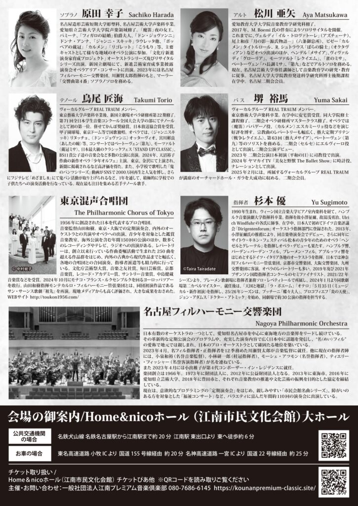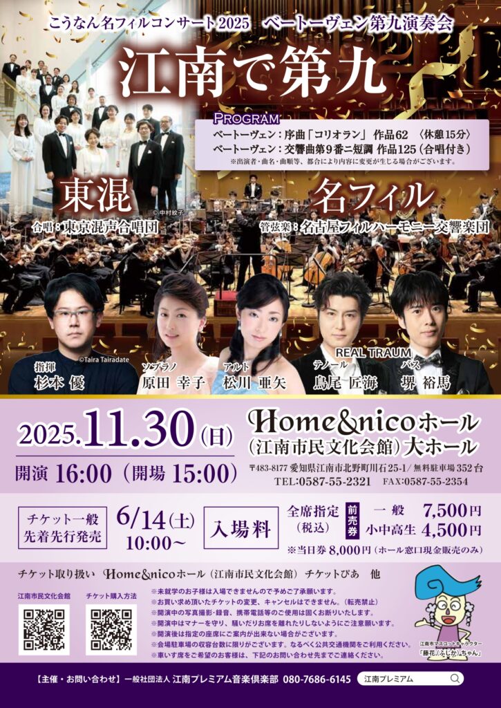 江南で第九!♪原田幸子(ソプラノ)さん、松川亜矢(アルト)さん、REAL TRAUM 鳥尾匠海(テノール)さん、堺裕馬(バス)さん、東京混声合唱団(合唱)!名フィル!!『こうなん名フィルコンサート2025 ベートーヴェン第九演奏会』は、11/30(日)!