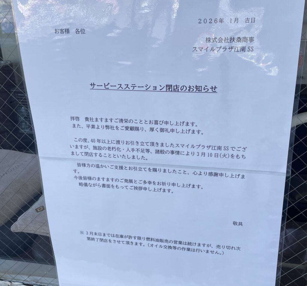 「40年以上に渡りお引き立て頂きましたスマイルプラザ江南SSでございますが、施設の老朽化・人手不足等、諸般の事情により3月10日(火)をもちまして閉店することといたしました」と貼り紙がしてありました。