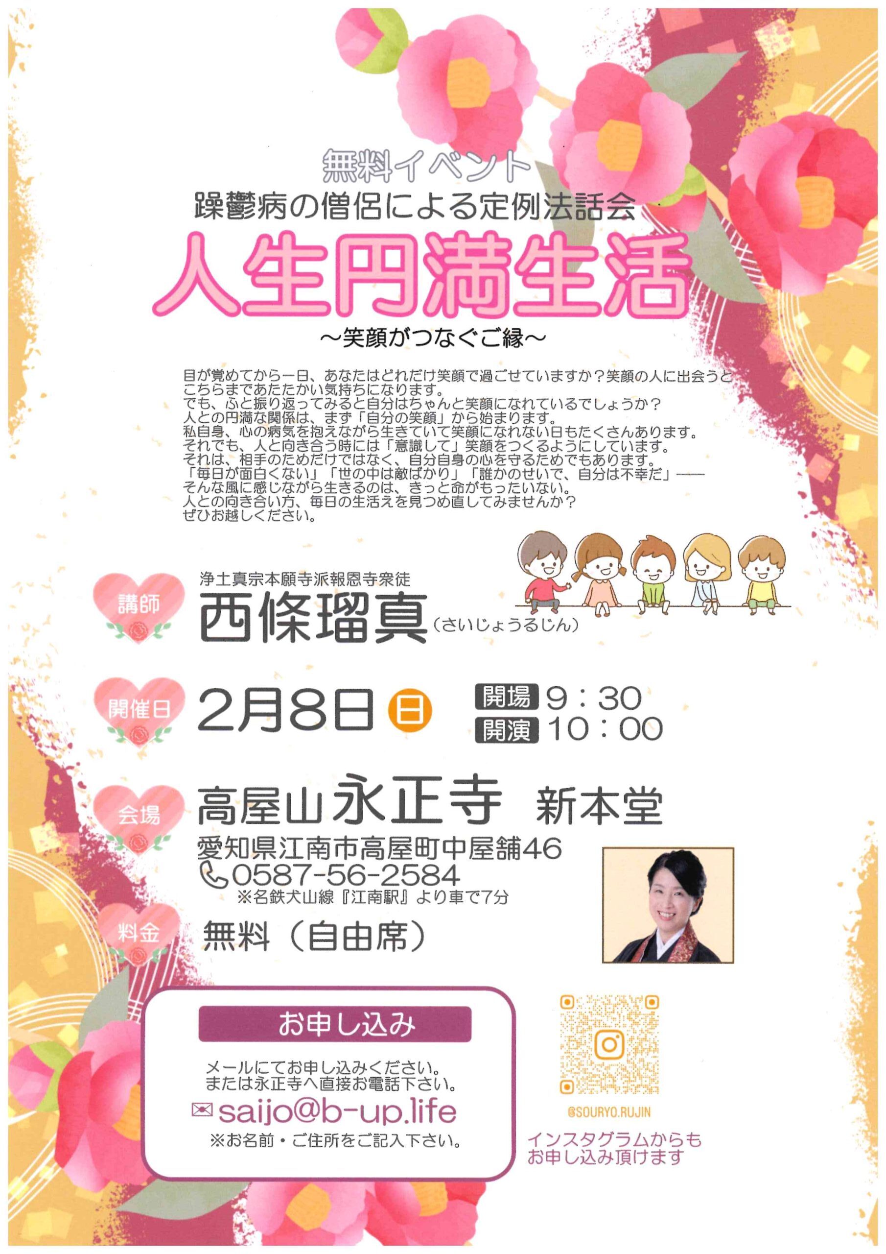 西條瑠真さん「人生円満生活」2/8(日)10時永正寺『定期法話会』毎月8日開催定期法話会お問い合わせは、永正寺(0587-56-2584)へお願いいたします。
