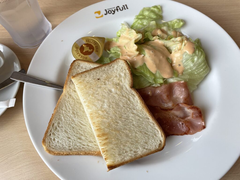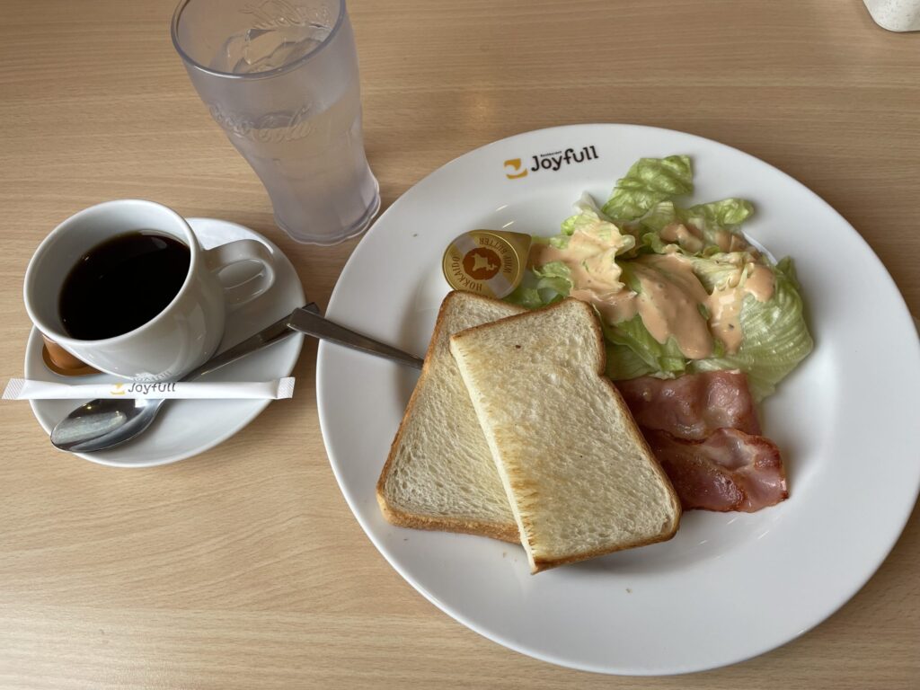 「おてごろモーニング」のベーコンモーニングは、トーストにベーコン、野菜がついて、ドリンクバー!それで税込328円!「ジョイフル愛知江南店」!