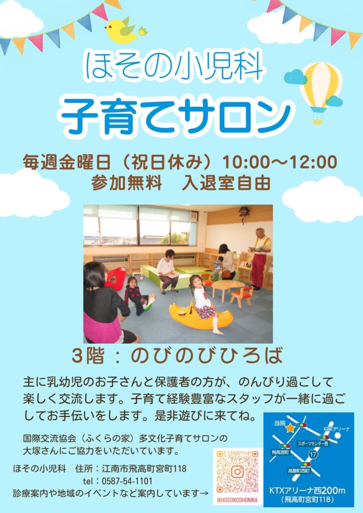 「ほその小児科」で、毎週金曜日『子育てサロン』がはじまるんだって!