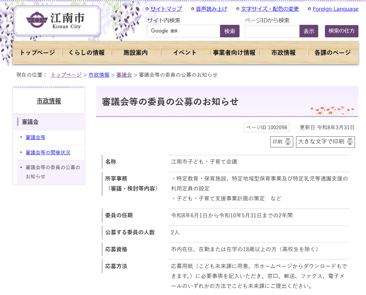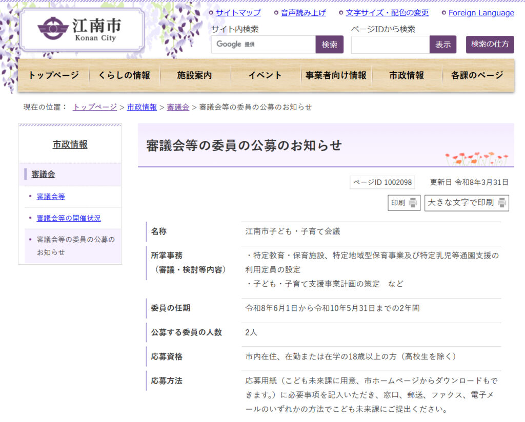 子ども・子育て会議!生涯学習懇話会!上下水道事業経営審議会!委員を公募しているんだって!
