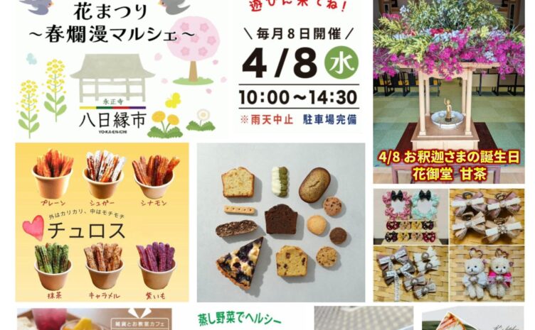 イベント お釈迦さまの誕生日は4/8!甘茶!花御堂!四国八十八か所お砂踏み!西国三十三観音掛け軸!ベーグル、キンパと惣菜モーロール!など!『花まつり〜春爛漫マルシェ〜』!など!明日4/8(水)!